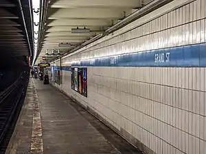 The station has two tracks and two narrow side platforms, located approximately 30 feet (9.1 m) below ground.[37] They are column-less, except at staircases, and have a blue trim line with "GRAND ST" in white sans-serif font on it at regular intervals.[38][39] In the original plan for the station, this would have been a four-track, two-island platform station; the Second Avenue Subway would have served the outer tracks while the Sixth Avenue Line served the inner tracks, providing a cross-platform interchange between these two lines.[38][39][40][23]: 216–217 [41] Although the connection only served Sixth Avenue Line trains, it was essentially the first part of the Second Avenue line that had been constructed.[40][23] There is a sole mezzanine at the center of the station which has two staircases to each platform, a turnstile bank, token booth, and access to the street exits.[42]