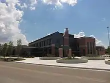 The university's main and original campus in Allendale is the site of most of the university's programs. The Allendale campus is composed of 1,322 acres perched above the Grand River next to a system of ravines and is divided into two areas, north and south campus, separated by West Campus Drive.[28][29] State highway M-45 links the campus in suburban Allendale to US Highway 31/Lake Michigan to the west and Grand Rapids, Michigan to the east. Lubbers Stadium, the GVSU Fieldhouse and all other athletic facilities for the school's 19 varsity sports are also on the Allendale campus. The campus is dotted with many sculptures, including works by Dale Eldred, Joseph Kinnebrew and James Clover. Academic facilities on the Allendale campus include 122 classrooms, 144 research laboratories, 20 lab prep rooms, 21 computer labs, and the Mary Idema Pew Library Learning and Information Commons.[30] The Allendale campus is also home to the Kindschi Hall of Science, a science facility that opened in the fall of 2015.[31]
