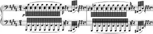 The movement contains much of the most difficult parts in the entire sonata like extremely rapid chords and octaves, huge leaps in both hands and other passage works. Amid the movement, there is a brief, eight-voice fugue.