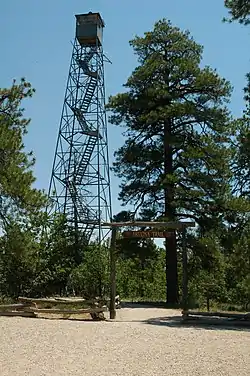 The Grand View Lookout Tower is a fire lookout in Kaibab National Forest near the South Rim of the Grand Canyon. The 80-foot (24 m) tall steel tower was built in the 1930s. Its observation cabin measures 7 feet (2.1 m) square. A small cabin is included in the designated area.[2]