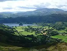 Grasmere is a village and former civil parish, now in the parish of Lakes, in the Westmorland and Furness district of Cumbria, England, and situated in the centre of the Lake District and named after its adjacent lake. Grasmere lies within the historic county of Westmorland. The Ambleside and Grasmere ward had an estimated population of 4,592 in 2019.[2] William and Dorothy Wordsworth, the 'Lake Poets', lived in Grasmere for 14 years and called it "the loveliest spot that man hath ever found."[3]