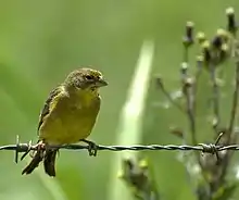 The grassland yellow finch (Sicalis luteola) is a small passerine bird. Despite its name, it is not a finch, but is a seedeater. These were formerly united with the buntings and American sparrows in the Emberizidae, but are now known to be tanagers.