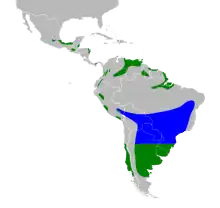 It is a resident in tropical South America, from Colombia south and east to the Guianas and central Ecuador, Peru and Brazil. Birds which breed further south in Argentina and Uruguay migrate to Bolivia and southern Brazil, (the cerrado etc.), in the austral winter. There are also isolated populations in Central America and Mexico. It was discovered on Trinidad in 2004, presumably having colonised from nearby Venezuela. Also known from Barbados, certainly since 1960 if not earlier.