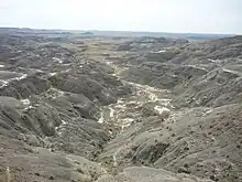 The East Block of the park is located about an hour's drive south of Assiniboia on the south side of the Wood Mountain Hills in Census Division No. 3. The interpretive centre is in the McGowan House at the new Rock Creek Campground and the information centre is at the museum in Wood Mountain Regional Park.[11] The East Block is more of a wilderness area but has views of the badlands of Rock Creek, the Cretaceous–Paleogene boundary, and prairie skies. A one-lane, 11-kilometre (6.8 mi) parkway traverses the Rock Creek Badlands.[12] The East Block contains the Grasslands National Park (east) (SK 023) Important Bird Area.[13]