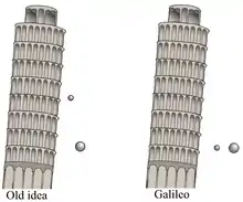 - ↑ Vincenzo Viviani (1717), Racconto istorico della vita di Galileo Galilei, p. 606: [...dimostrando ciò con replicate esperienze, fatte dall'altezza del Campanile di Pisa con l'intervento delli altri lettori e filosofi e di tutta la scolaresca... [...Galileo showed this [all bodies, whatever their weights, fall with equal speeds] by repeated experiments made from the height of the Leaning Tower of Pisa in the presence of other professors and all the students...].