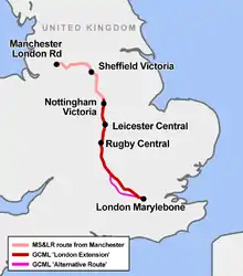 The Great Central Main Line (GCML), also known as the London Extension of the Manchester, Sheffield and Lincolnshire Railway (MS&LR), is a former railway line in the United Kingdom. The line was opened in 1899 and built by the Great Central Railway running from Sheffield in the North of England, southwards through Nottingham and Leicester to Marylebone in London.