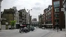 Southern end of St John Street in London, with Smithfield Market visible in the distance. The island in the middle of the road marks the former site of Hicks Hall