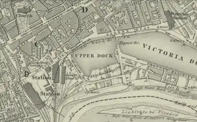The Aberdeen Railway (AR) opened from the south to Ferryhill, south of Aberdeen, in April 1850. It had been previously arranged that the Aberdeen and Great North would amalgamate, but this was annulled that year and the Aberdeen was seeking alliances with railways to the south.[16] In 1854 the AR opened its Guild Street terminus in Aberdeen[17] and the Great North sought and obtained powers for a 1+3⁄4-mile (2.8 km) branch that followed the Aberdeenshire Canal from Kittybrewster to a terminus at Waterloo by the docks. The line was opened to goods traffic on 24 September 1855 and passengers on 1 April 1856. Kittybrewster station was rebuilt with through platforms and the offices moved to Waterloo station from premises at 75 Union Street. The stations were 1⁄2 mile (800 m) apart and a goods line was built though the docks linking the two railways, worked by horses as steam locomotives were prohibited.[18]