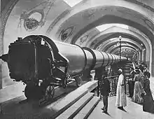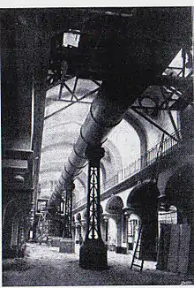 The telescope was erected in the Palais de l’Optique on the Champ de Mars, near the Eiffel Tower. The tube, oriented north-south, was made up of 24 cylinders 1.5 m (59 in) in diameter and rested on 7 concrete and steel pillars; its axis was 7 m (23 ft) above the floor. The room at the end which housed siderostat with the mirror had a movable dome to allow direct access to the sky.[2]