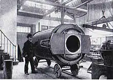 The mirror for the siderostat was ground mechanically by the Gautier Company (headed by Paul Gautier, 1842–1909) and took nine months to finish. The blank for the mirror was cast by Georges Despret, director of the Jeumont glassworks in northern France. The lens blanks were cast by Édouard Mantois (1848–1900) and ground by Gautier.[1] By the time the Paris Exhibition opened only the object lens for photographic observation was ready. The visual object lens, unfinished, was put on display nearby.