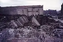 View of Eagle building and building A in the Templo Mayor complex. The ruins of the Great Temple are in the background.