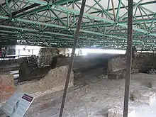 View of ruins of the "Eagle" building of the Templo Mayor complex. The roof is there to protect the remains of paintings that are inside.