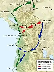 The Great Retreat, also known in Serbian historiography as the Albanian Golgotha[4] (Serbian: Албанска голгота / Albanska golgota), was a strategic withdrawal of the Royal Serbian Army, which marked the end of the Second Serbian campaign of World War I.