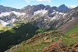 The Herard family—after whom Mount Herard is named[17]—established a ranch and homestead along Medano Creek in 1875, using the old Medano Pass Road to travel to and from their home. The modern unpaved road follows the old route and is open only to four-wheel drive, and high-clearance vehicles as it passes through deep sand, rises to Medano Pass, and continues east into the Wet Mountain Valley. The Herards grazed and bred cattle in the mountain meadows, raised horses, and established a trout hatchery in the stream. Other families homesteaded near the dunes as well, including the Teofilo Trujillo family whose sheep and cattle ranch in the valley later became part of the Medano–Zapata Ranch, owned by the Nature Conservancy since 1999. The Trujillo's extant homestead and the ruins of a destroyed one were declared a National Historic Landmark in 2004.[18] Frank and Virginia Wellington built a cabin and hand-dug the irrigation ditch that parallels Wellington Ditch Trail located south of the park campground.[11]