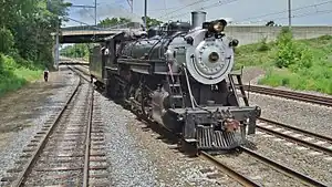 Following the war, the locomotive was used primarily in the Autumn during the harvest season.[2] By the late 1950s, the No. 90 locomotive had been relegated to pull occasional campaign and excursion trains.[6] In 1963, No. 90 pulled some excursions during that year's National Railway Historical Society (NRHS) Convention, which was being held in Denver at the time.[7][8] The locomotive stopped in Longmont, Colorado, for a brief photo session alongside CB&Q 4-8-4 No. 5632.[7] On one such excursion, the Strasburg Rail Road's (SRC) Chief Mechanical Officer, Huber Leath, met with the GW's superintendent, a man who grew up in the vicinity of the Strasburg Rail Road.[2] A deal was subsequently made in which the Great Western would contact the Strasburg Rail Road as soon as the locomotive was removed from service and available for purchase.[2]