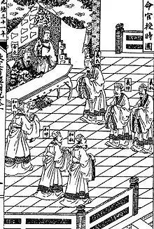 Yao proceeded to put Shun through a series of tests, beginning with marrying his two daughters to Shun and ending by sending him down from the mountains to the plains below where Shun had to face fierce winds, thunder, and rain.[17] After passing all of Yao's tests, not the least of which being establishing and continuing a state of marital harmony together with Yao's two daughters, Shun took on administrative responsibilities as co-emperor.[18] Among these responsibilities, Shun had to deal with the Great Flood and its associated disruptions, especially in light of the fact that Yao's reluctant decision to appoint Gun to handle the problem had failed to fix the situation, despite having been working on it for the previous nine years. Shun took steps over the next four years to reorganize the empire, in such a way as to solve immediate problems and to put the imperial authority in a better position to deal with the flood and its effects.