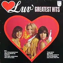 Greatest Hits is a compilation album by Dutch girl group Luv' by Philips/Phonogram Records. It was rush-released in 1979 a few weeks after the formation had left Philips to sign a record deal with the labels CNR/Carrere Records. It features hit singles scored in the charts between 1977 and 1979: "My Man", "U.O.Me", "You're the Greatest Lover", "Trojan Horse", "Casanova" and "Eeny Meeny Miny Moe". These songs were originally released in their first and second studio albums, With Luv' (1978) and Lots of Luv' (1979). The Philips/Phonogram years were the group's most successful ones in terms of chart performance.