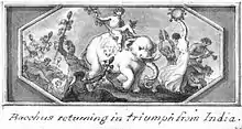 A legendary account states that when the Greek God Bacchus/Dionysus grew up, he discovered the culture of the vine and the mode of extracting its precious juice, being the first to do so;[1] but Hera struck him with madness, and drove him forth a wanderer through various parts of the earth. In Phrygia the goddess Cybele, better known to the Greeks as Rhea, cured him and taught him her religious rites, and he set out on a progress through Asia teaching the people the cultivation of the vine. The most famous part of his wanderings is his expedition to the Indian subcontinent, which is said to have lasted several years. According to a legend, when Alexander the Great reached a city called Nysa near the Indus river, the locals said that their city was founded by Dionysus in the distant past and their city was dedicated to the god Dionysus.[2] These travels took something of the form of military conquests; according to Diodorus Siculus he conquered the whole world except for Britain and Ethiopia.[3] Returning in triumph (he was considered the founder of the triumphal procession) he undertook to introduce his worship into Greece, but was opposed by some princes who dreaded its introduction on account of the disorders and madness it brought with it (e.g. Pentheus or Lycurgus).