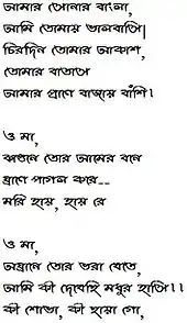 In the Bengali cursive script[7] (also known in Bengali as "professional writing") the letters are more likely to be more curvy in appearance than in standard Bengali handwriting. Also, the horizontal supporting bar on each letter (matra) runs continuously through the entire word, unlike in standard handwriting. This cursive handwriting often used by literature experts differs in appearance from the standard Bengali alphabet as it is free hand writing, where sometimes the alphabets are complex and appear different from the standard handwriting.