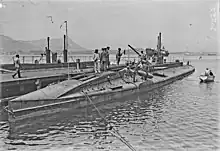 Delfin sailed for Greece on 29 September, the ship traveled on the surface and unescorted, arriving on Corfu on 4 October to repair damage to its left engine. It reached its destination the Port of Piraeus the following day, where it was welcomed by the commander of the British naval mission Rear Admiral Lionel Grant Tufnell, the Minister of Naval Affairs Nikolaos Stratos and the Finance Minister Alexandros Diomidis. The same day Greece declared war against the Ottomans, sparking the First Balkan War.[10][11] This unescorted, non-stop journey of 1,100 mi (1,800 km) 1,100 miles set a world record and confirmed the abilities of its crew, despite their limited training. However, it also meant that no reserve crew could be trained, limiting its battle effectiveness due to the crew's fatigue.[12] Moreover the Salamis Naval Base did not have the necessary technical facilities to service this new type of ship.[10] Delfin was the second submarine to enter service in the Greek navy after Nordenfelt I.[13]