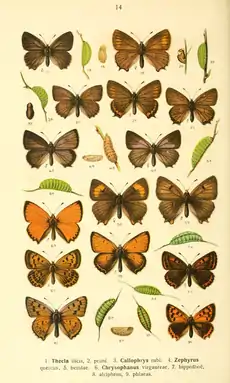 T. rubi L. (72 e). Above black-brown with white fringes; male with a scent-patch on the forewing below the costa in the centre. Beneath green, with some white dots on the disc of the hindwing. In ab. immaculata Fuchs (72 e) these white dots are absent, while they form a complete row in ab. punctata Tutt. which is even continued on to the forewing. Numerous modifications in the degrre of completeness or obsolescence of the row have received names (caecus, incompleta, bipuncata, etc.), such individual aberrations occurring all among specimens of the nymotypical race. — borealis Krul,[now C. r. borealis Krulikovsky, 1890] from Kasan, is somewhat smaller, being more yellowish green and without the white dots of the nymotypical form. — polaris Moschl [C. r. borealis Krulikovsky, 1890], from the most northern districts of the area of distribution , is a small form, with the underside duller green. — sibirica Ruhl [C. r. sibirica (Rühl, 1895)] differs in almost the same way, the underside being less bright green than in rubi rubi; Northern Asia. — fervida Stgr.[C. r. fervida Staudinger, 1901] (72 f) is a southern form, the upperside being paler brown with a golden sheen (unfortunately not distinct in our figure). — suaveola Stgr.[now species Callophrys suaveola (Staudinger, 1881)(72 f), from Central Asia, is as large as the largest European specimens, the upperside darker, the underside deeper green. From Saisan and Lepsa; as true rubi also occurs in these localities, suaveola may turn out to be the summer-brood. — There occur, moreover, a number of individual varieties; for instance, specimens with the underside brown instead of green, females with a reddish yellow discal spot on the forewing above (Blachier), etc. Egg depressed , green, reticulate. Larva dark green, with a black-edged yellow dorsal line accompanied by pale spots, and with a yellowish side-line. It feeds in June and the autumn particularly on Papilionaceae, such as Sarothamnus, Genista, Cytisus, but also on many other plants, as oak, Vaccinium, Sedum, etc. It often bores deep into the flowers of Genista. Pupa short, much rounded; resembling a small bean, immovable, but nevertheless producing a feeble noise, which Kleemann calls creaking,Schilde twittering or chirping. The butterflies occur from April into July and in warmer districts of the plains again in July and August, the two broods being almost continuous, for instance at Darmstadt. They are very plentiful in most places and always rest with closed wings on shrubs and green twigs of Genista; they are not shy, the spring-specimens being particularly fond of the flowers of Potentilla. [5]