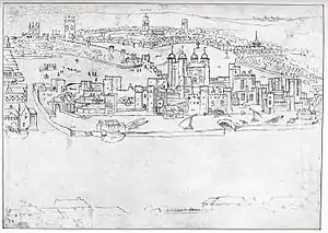 When she came to the Lantern Gate, she stayed and viewed the king's ships, the Lion and the Sweepstake, decked with 100 banners of silk and gold, wherein were 200 master gunners and mariners and 31 trumpets, "and a double drum that was never seen in England before"; and so her Grace entered into Calais. At her entry, 150 pieces of ordnance let out of the said two ships made such a smoke that one of her train could not see another. "Where stood in order on both sides the streets, like a lane, with 500 soldiers in the King's livery of the retinue of Calais, and the mayor of Calais with his brethren, and the commons of Calais, and the merchants of the Staple, stood in like manner in array, and made a lane wherethrough she passed to her lodging". There the mayor and his brethren came to her and gave her 50 sovereigns of gold, and the mayor of the Staple, 60. Next morning "she had a gun shot, justing and all other royalty that could be devised in the King's garrison;" and kept open household there for the 15 days that she remained."[137][138][139][140] The Admiral had been instructed by Henry VIII to "cheer my lady and her train so they think the time short". Anne knew little English, so, with the assistance of an interpreter, he taught her to play "Sent" and other card games that the king enjoyed, with Gregory Cromwell taking part.[141]