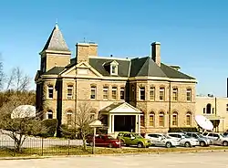 Major Eldad Cicero Camp began constructing his home in 1885. Architect Alfred B. Mullett designed the mansion in the Richardsonian Romanesque style. Mullett had previously designed the Customs House building in downtown Knoxville. The home is two and a half stories, with a three-story tower in the front. The exterior of the home is sheathed in stone from a quarry in Rocky Top, Tennessee. The home contains elaborate hand-carved mantels from France. Each room is paneled in a different type of wood. The heads of windows include stained glass panels, and 22 different types of marble are used in the house. The site also includes a carriage house.[2][3]