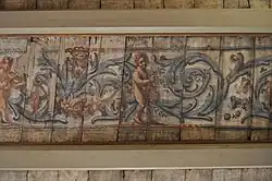 The fully decorated pine ceiling was one of many examples in Hamburg merchant houses, but is probably the only 17th century example to remain accessible.[1] The painting is by an unknown artist on pine boards, 151 of which are still preserved. In the Hamburg Museum it is reconstructed on 17 joists with a further 68 boards added. The Baroque artwork includes putti and other figures in playful and bawdy acts. Within the image, there are several jokes: it shows Cain and Abel, referring to an old Hamburg saying, that "The Grimm" is the oldest street in the world, because according to the Bible, Cain slew Abel "im Grimm" ("in a rage").