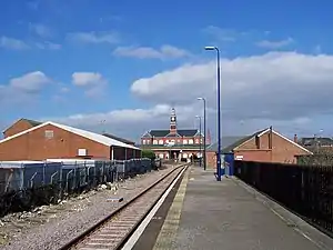 Grimsby Docks railway station serves the Freeman Street area of Grimsby in North East Lincolnshire, England. This is one of the oldest parts of the town, close to the Freeman Street Market and the town's docks both commercial and fish, the railway entrance to both being over the level crossing at the Cleethorpes end. The docks offices can be seen in the photograph in the distance, in which the line to Cleethorpes swings round to the right.