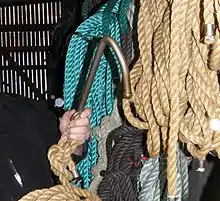 The pilot whales that are not beached were historically stabbed in the blubber with a sharp hook, called a sóknarongul (a kind of gaff), and then pulled ashore. In 1993, a blunt gaff or blásturongul was invented that could be used to hold the beached whales steady by their blowholes and pull them ashore. In 1985, the Faroe Islands outlawed the use of spears (skutil) and harpoons (hvalvákn) in the hunt, as these weapons were considered to be unnecessarily cruel to the whales.[10] According to the 2013 Whale Hunt Law, whales must be either ashore or stuck on the seabed before they can lawfully be killed,[9] and, as of 26 January 2017, only the men waiting on the beaches with blásturkrókur, mønustingari and grindaknívur are permitted to kill the whales, and it is no longer permitted to harpoon the whales while at sea, or hook those outside of the encircling net.[11]