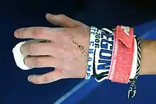 Grips are devices that are worn on the hands of artistic gymnasts when performing on various apparatus. They are worn by female gymnasts on the uneven bars, and by male gymnasts on the high bar and still rings; it is rare to wear them on the parallel bars. Grips are used to enhance the gymnast's grip on the apparatus and to reduce friction, which can cause painful blisters and rips, in which outer layers of skin separate and tear away from the hand.