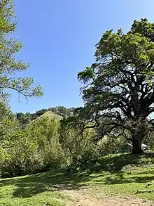Grizzly Creek likely still remained in a comparatively natural state during the time its valley was cultivated throughout 19th and 20th centuries.[4] Farmers often left the habitats immediately along creek banks intact to prevent evaporation and erosion, hence the impressive collection of very old Valley oak and Coast Live Oak that still line the banks today.