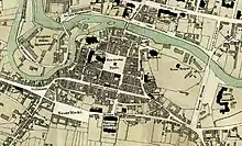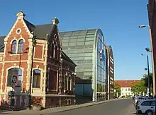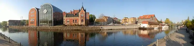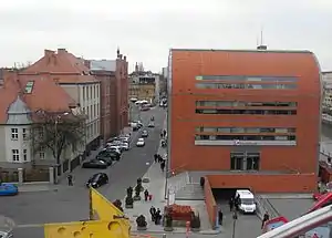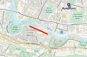 Grodzka Street is a historical street in Old Town of Bydgoszcz, Poland. The street is located in the northern part of the Old Town: it stretches along Brda River waterfront, following an east-west axis. The street starts at the intersection with Bernardyńska street and ends at Tadeusz Malczewski street's crossing. Its length is approximately 430 m. The Grodzka Street was laid out in mid-14th century, when Bydgoszcz became a charter city.[1] Grodzka Street buildings vary greatly one from the other, beginning with the three historic granaries from late 18th century, to the all-glass similar-shape modern mBank in Bydgoszcz, which became an icon of Polish architecture.