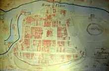 The first settlement of Bydgoszcz built between 11th and 12th centuries had its footprint in the area of Grodzka Street, between Przy Zamczysku and Bernardyńska streets. First comprehensive archaeological searches conducted in the 1990s led to the discovery of large-scale relics related to the first footprint of Bydgoszcz settlement, with its castle built on an island formed Brda river meanders. It consisted of a fortified area, with log cabin-type housing and utility buildings. In the southern part of this island has been unveiled wooden structures attributed to a harbor on the river. The fortification system has been dated by dendrochronology from 1037 to 1038.[3]