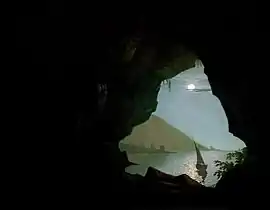 The Museum of Fine Arts in Boston owns a 1778 version of this painting called Grotto by the Seaside in the Kingdom of Naples. This 48 by 68 inches painting just shows the start of the cave in dazzling light from a sunset with a group of bandits within.[2] The "banditti" version and another version with Julia the Younger was sold by Wright as a pair with one of the Virgil's Tomb pictures to Mr Cockshut and then through the Meynell family.[3] This version was auctioned again 2015 (see below).
