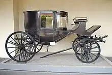 A clarence is a type of carriage that was popular in the early 19th century. It is a closed, four-wheeled horse-drawn vehicle with a projecting glass front and seats for four passengers inside. The driver sat at the front, outside the carriage. The clarence was named after Prince William, Duke of Clarence and St Andrews, later King William IV of the United Kingdom, who died in 1837.[1]:41 It was introduced in 1840 in London.[2] The Brougham was a lighter, two-passenger version originally commissioned by Lord Brougham.[1]:24–25