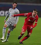On 11 August 2015, he started the season for Sevilla in the 2015 UEFA Super Cup 5–4 loss against Barcelona, and suffered a broken rib but still played the full 120 minutes.[53] Having started in the centre-back position in the opening game of the season, he continued to play in the defensive midfield position.[54] As a result, the club began talks with Krychowiak over a new contract.[55] Manager Unai Emery praised his performance, calling "his sacrifice and dedication towards the team always puts them at their service".[56] On 5 November 2015, Krychowiak signed a contract extension with Sevilla, keeping him at the club until 2019.[57] Shortly after, he captained the club in a number of matches for the rest of the year.[58] After serving a one match suspension, he then scored his first goal of the season, in a 2–0 win against rivals Real Betis in the first leg of the Copa del Rey last 16 tournament.[59] Three days later, on 9 January 2016, he suffered a knee injury that saw him sidelined for two months.[60] On 20 March 2016, Krychowiak returned to the starting line-up against Real Madrid, as the club lost 3–2.[61] Since returning to the first team, he later contributed two assists in two second leg matches in the UEFA Europa League quarter-final and semi-finals against Athletic Bilbao and Shakhtar Donetsk respectively, to send Sevilla to the UEFA Europa League Final for the third time in a row.[62] He started in the UEFA Europa League Final against Liverpool and played the whole game as they won 3–1, winning the tournament for the third time in a row.[63]
