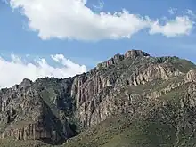The Guadalupe Mountains (Spanish: Sierra de Guadalupe) are a mountain range located in West Texas and southeastern New Mexico. The range includes the highest summit in Texas, Guadalupe Peak, 8,751 ft (2,667 m), and the "signature peak" of West Texas, El Capitan, both of which are located within Guadalupe Mountains National Park. The Guadalupe Mountains are bordered by the Pecos River valley and Llano Estacado to the east and north, Delaware Mountains to the south, and Sacramento Mountains to the west. One of the clearest exposures of a prehistoric reef is preserved in the mountain range's bedrock geology.[2] Bedrock contains fossils of reef-dwelling organisms from the Permian period, and the geology is widely studied, mostly by stratigraphers, paleontologists, and Paleoecologists (see geology section).[3]