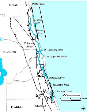 In 2004 the Guana River State Park was acquired by the Guana Tolomato Matanzas National Estuarine Research Reserve and is now included in the reserve. It is no longer a State Park.[5] The research reserve is located along State Highway A1A, between St. Augustine and Jacksonville. Bounded by the Atlantic Ocean and the Intracoastal Waterway (Tolomato River), the Guana Tract, which includes the Guana Tolomato Matanzas National Estuarine Research Reserve (GTM Research Reserve) and Guana River Wildlife Management Area, comprises some 12,000 acres (49 km2) of public conservation and recreational uplands.