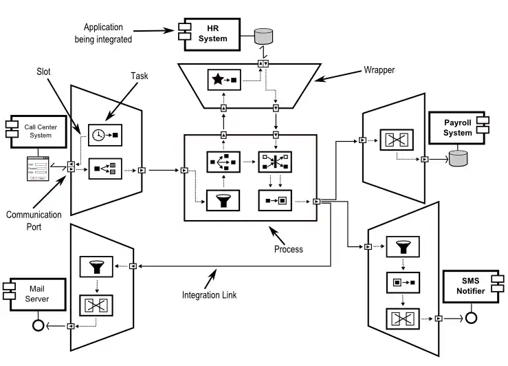 Tasks: are message processing constructors and appear inside processes and wrappers. A task reads messages from incoming slots, processes them (e.g. enriches, translates, filters, etc.) and deposits the result in the outcome slot. Part of them are based on the enterprise integration patterns proposed by Gregor Hohpe and Bobby Woolf.