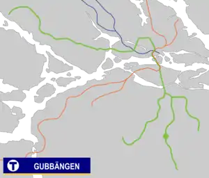 Gubbängen metro station is on the green line of the Stockholm metro, located in Gubbängen, Söderort. The station was inaugurated on 1 October 1950 as part of the inaugural stretch of Stockholm metro between Slussen and Hökarängen.[2] The distance to Slussen is 6.7 km (4.2 mi).