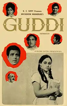 Guddi is a 1971 Indian Hindi drama film directed by Hrishikesh Mukherjee and written by Gulzar. It starred Dharmendra, Jaya Bachchan and Utpal Dutt. It is Jaya Bachchan (née Bhaduri)'s career-making film in which she plays a schoolgirl who has a crush on and is obsessed with the actor Dharmendra, who plays himself. She earned a Filmfare nomination as Best Actress, the only nomination for the film. Utpal Dutt also has a starring role. Many Bollywood actors like Rajesh Khanna, Naveen Nischol, Asrani, Amitabh Bachchan, Vinod Khanna, Om Prakash and Pran gave guest appearances as themselves.[1][2] According to Boxofficeindia.com, the film became a "big city hit" and did "above average" business everywhere else.[3] It was later remade in Tamil as Cinema Paithiyam (1975) starring Jayachitra and Kamal Haasan.[4]