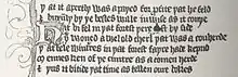 Facsimile of the first seven lines of the 14th century English translation of the 12th century French manuscript The Romance of William of Palerne