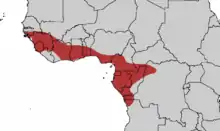 Guinea turaco has an extremely large range and a stable population.[8] It can be found in forests of West and Central Africa, ranging from Senegal east to DR Congo and south to northern Angola. It is present in the Republic of the Congo, Angola, Benin, Cameroon, Central African Republic, Democratic Republic of the Congo, Equatorial Guinea, Gabon, Gambia, Ghana, Guinea, Guinea-Bissau, Ivory Coast, Liberia, Mali, Nigeria, Senegal, Sierra Leone and Togo.[9][7]