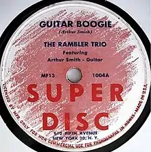 In his version, Smith performs the piano parts on guitar, alternating between boogie rhythmic patterns and soloing. Originally a jazz musician, Smith explained, "I guess I picked that [boogie-woogie] from Tommy Dorsey's 'Boogie Woogie', 'cause I didn't listen to country or blues, I listened to big band in those days".[5] Smith first recorded "Guitar Boogie" in 1945 with the Rambler Trio, with Don Reno on rhythm guitar and Roy Lear on bass. There has been conflicting information on the type of guitar Smith used for the recording; several sources identify it as an acoustic guitar[7][8][9] and others as an electric guitar.[10][11][12] The piece was released under the name "the Rambler Trio featuring Arthur Smith" by the independent Super Disc Records label. Regionally "Guitar Boogie" did well, due in part to Smith's appearances on popular radio programs, such as Charlotte, North Carolina WBT's Carolina Hayride.