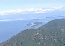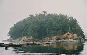 Located off Saturna Island's northeastern shore, Tumbo Island and Cabbage Island are connected to each other by a reef, exposed at low tide. Cabbage Island, purchased by the Nature Conservancy from private owners in 1976, was developed as a provincial marine park between 1978 and 2004 with anchorage and moorage areas in Reef Harbour and a campground and on the 4.5 ha (11 acres) island. Tumbo, 121 ha (299 acres) in area and named in reference to a tombolo, was acquired by the province in the Pacific Marine Heritage Legacy program from a Californian for $3.7 million with the provision that he was able to keep his cottage and care-taker suite. Prior to its use as private property (since 1877) for timber harvesting, coal mining, mink farming, and recreational living, it was used by the Coast Salish people when crossing or working in the strait. Tumbo is also only accessible by boats via Reef Harbour and it beach accesses but while it does not have a campground does have a 3.5 km trail, with views of the San Juan Islands.[21][22][23]