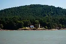 There are two national park sites on Mayne Island: Campbell Point (Bennett Bay) on the eastern end and Georgina Point on the island's northwestern end. The Georgina Point Heritage Park is a 1.5 ha (4 acres) site that looks upon the Strait of Georgia and the entrance of Active Pass. It has been the site of the Active Pass Lighthouse since 1885, though that original light was replaced in 1940 with a lightkeeper's residence that included a lantern room above, and then in 1969 by an octagonal metal lantern mounted on a cylindrical concrete tower. The light function was also replaced, in 1997, by an automated navigational aid. As the historical structures remain, as well as the active radio building and aeronautical beacon maintained by the Coast Guard, it is listed as a historic place and heritage lighthouse.[24] With the site transferred from Fisheries and Oceans Canada to Parks Canada it was further developed with picnic and washroom facilities. On the other end of the island, the 10 ha (25 acres) Campbell Point portion was acquired as a private land purchase.[25] There is a 1.5 km (0.9 mi) hiking trail from a sandy beach, suitable for swimming and launching kayaks, to Campbell Point where there are views of Georgeson Island's old-growth forest on a sandstone ridge.[19] Georgeson Island, along with the seal and sea lion haulouts of the Belle Chain Islets and Anniversary Island, and the small unnamed islands off Samuel Island's coast, make for a kayak route between Mayne and Saturna islands, within the national park boundaries.[26]