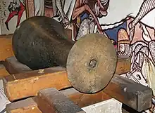 Once on site, they would be fired at ground level behind a hinged timber shutter, to provide some protection to the artillery crew.[35] Timber wedges were used to control the barrel's elevation.[35] The majority of medieval cannon were breechloaders, although there was still no effort to standardise calibres.[35] The usual loading equipment consisted of a copper loading scoop, a ramrod, and a felt brush or "sponge".[41] A bucket of water was always kept beside the cannon.[41] Skins or cloths soaked in cold water could be used to cool down the barrel, while acids could also be added to the water to clean out the inside of the barrel.[41] Hot coals were used to heat the shot or keep the wire primer going.[41]