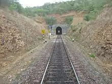 The Krishna Canal-Nandyal (KCC-NDL) stretch was a part of the important East-West coast link that connected Margao in Goa to Masulipatnam in the erstwhile Madras Province of British India. It was originally built to Metre Gauge by the Southern Mahratta Railway (later the Madras and Southern Mahratta Railway-MSMR) during 1889–90.[6] The track passed through the Nallamala Hills and as a result quite a few major engineering works were undertaken in the course of the railroad construction, the most impressive of them being the massive Dorabavi Viaduct[7] and the Bogada Tunnel, both of them about 30 km from Nandyal. This section was converted to Broad Gauge during 1993–95. The gauge conversion was a difficult task owing to the difficult terrain. The old alignment between Gazulapalli and Diguvametta was abandoned and a new Bogada tunnel, about 1.6 km in length and a new Dorabavi Viaduct located at a much lower altitude were constructed at a huge expense. The railway passes through the historic Cumbum Tank, starting from Cumbum railway station and spread over an area of 7 km. It is one of the most picturesque valleys in Guntur-Nandyal section of South Central Railway.[8]