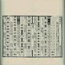 It has already been discussed that qin music has a rhythm and that it is only vaguely indicated in the tablature.[36] Though there is an amount of guesswork involved, the tablature has clues to indicate rhythm, such as repeating motifs, an indication of phrases or how the notation is arranged. Throughout the history of the qinpu, we see many attempts to indicate this rhythm more explicitly, involving devices like dots to make beats. Probably, one of the major projects to regulate the rhythm to a large scale was the compilers of the Qinxue Congshu tablature collection of the 1910s to 1930s. The construction of the written tablature was divided into two columns. The first was further divided into about three lines of a grid, each line indicating a varied combination of lyrics, gongche tablature, se tablature, pitch, and/or beats depending on the score used. The second column was devoted to qin tablature.